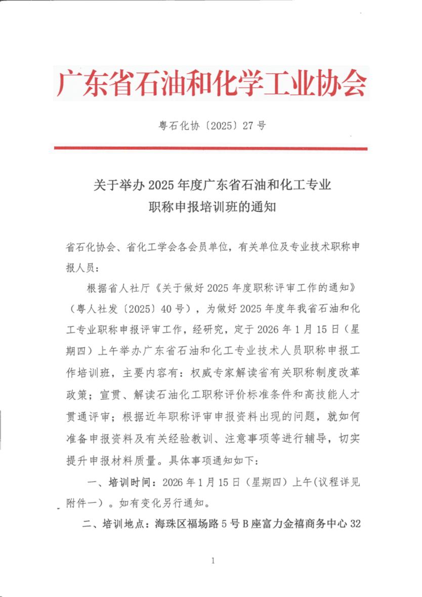 粤石化协[2025]27号-关于举办2025年度广东省石油和化工专业职称申报培训班的通知