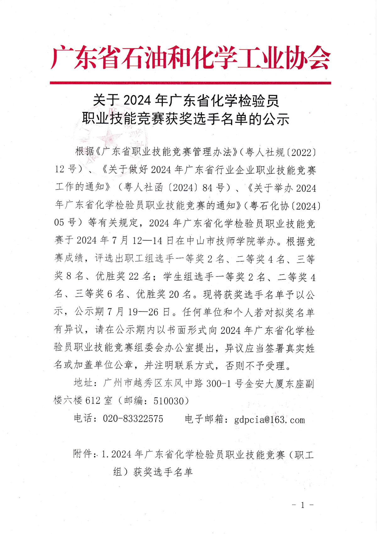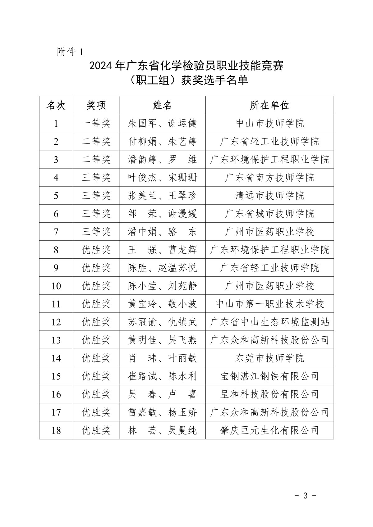 2024年广东省化学检验员职业技能竞赛获奖选手名单公示