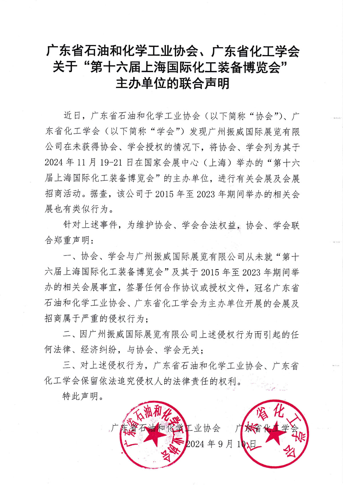 广东省石油和化学工业协会、广东省化工学会关于“第十六届上海国际化工装备博览会”主办单位的联合声明