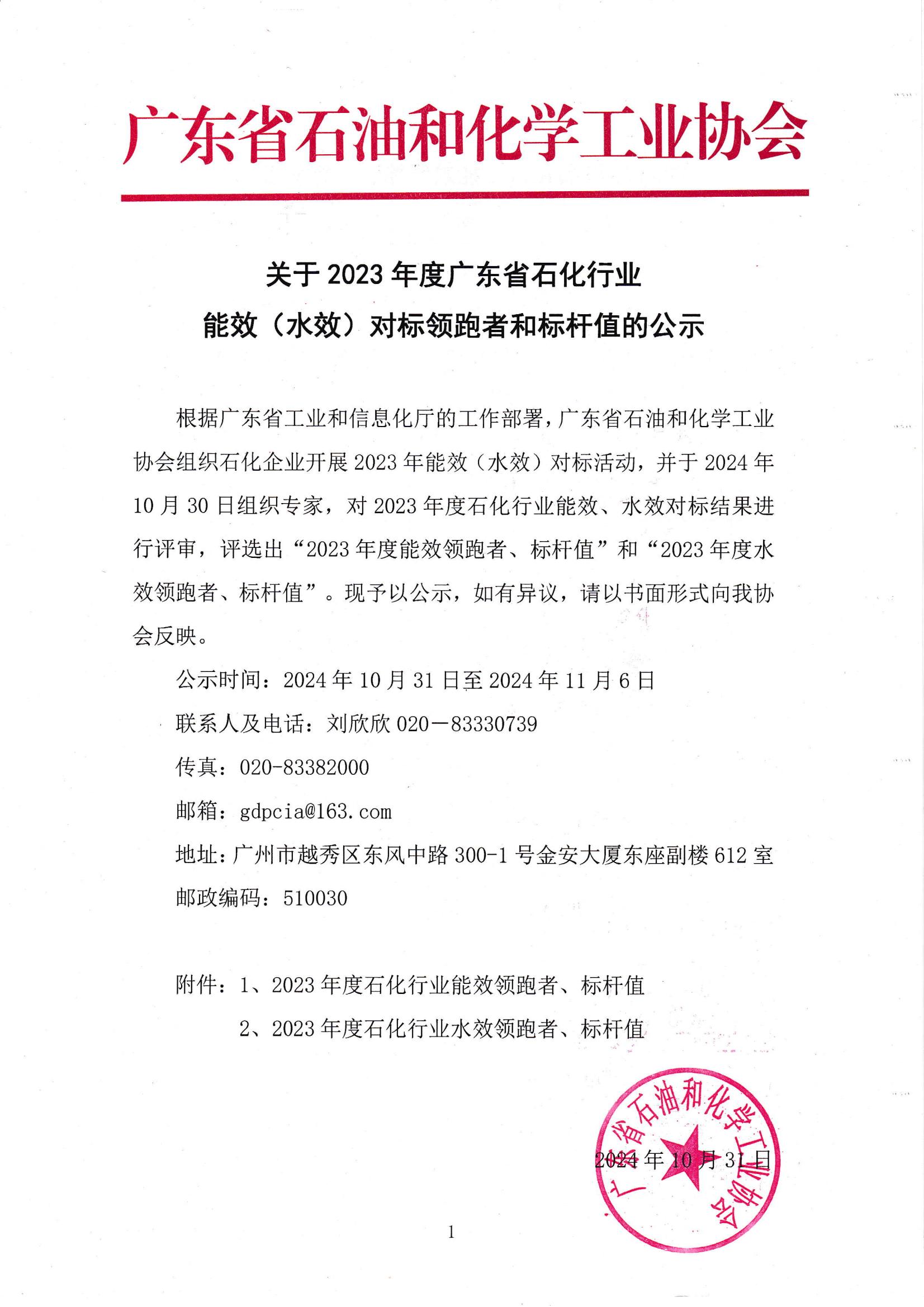 关于2023年度广东省石化行业能效(水效)对标领跑者和标杆值的公示