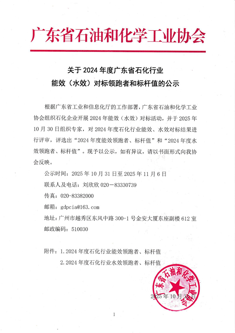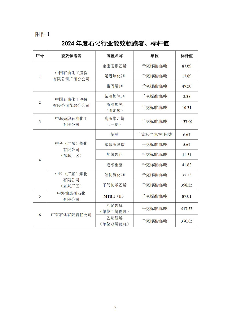 关于 2024年度广东省石化行业能效 (水效)对标领跑者和标杆值的公示
