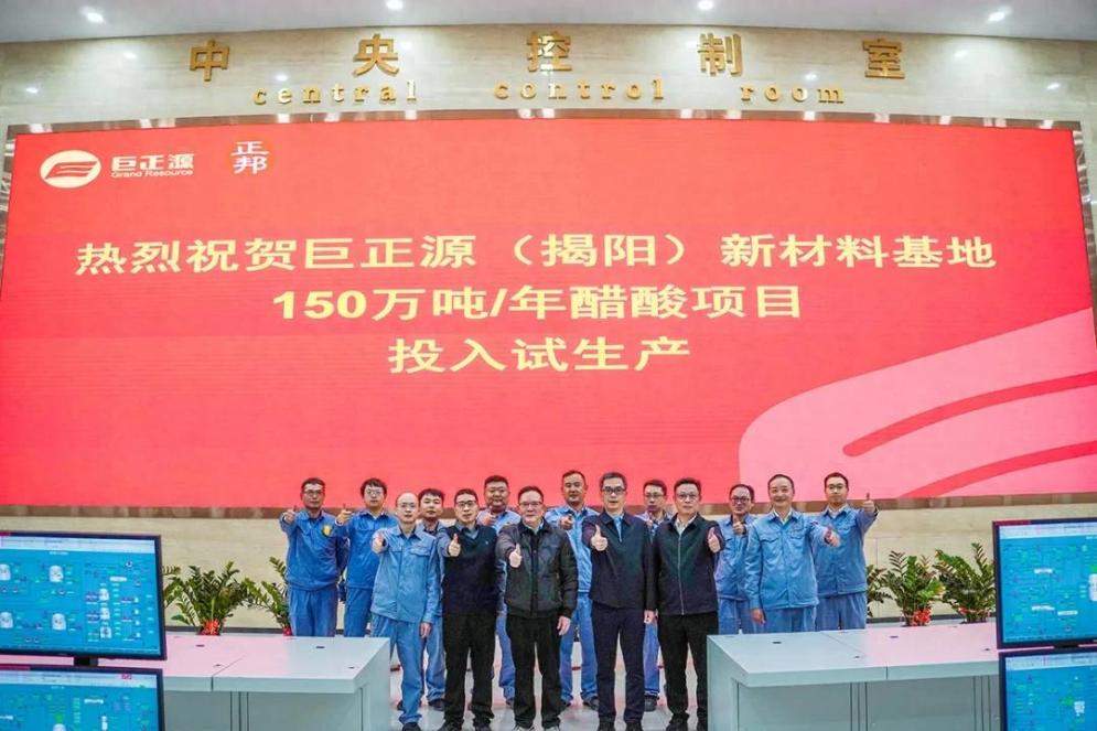 据巨正源官方网站消息,2025年12月31日,巨正源(揭阳)新材料基地150万吨/年醋酸项目顺利完成全部调试程序,一次引入合成气成功,打通全流程,正式进入试生产阶段。